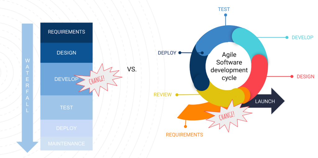 As we can see in this picture the Agile life cycle can be implemented faster and easier than in the waterfall one. But why? In Agile, teams break down deliverables into smaller pieces. As a release is where the users or client will see the changes that are being made, and they can take only 2 weeks; the priorities can be reordered during the refinement/planning and the change would be introduced faster in the next sprint (if necessary, and if the time to develop it and test it makes it possible).