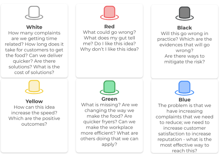 The Six Thinking Hats technique, when done correctly, will help in the process of decision making, providing individuals (or groups) with all they need to make good decisions and solve problems. The method of switching between different ways of thinking can also bring to the table new perspectives, increasing the quality of decisions and coming up with the ultimate best solutions to the business.