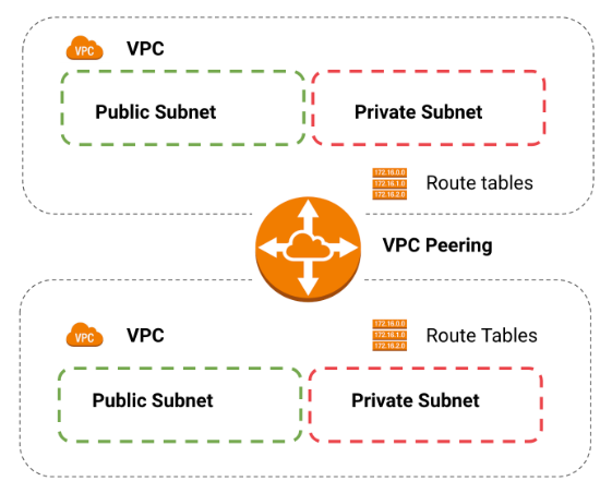 - VPC peering is a networking connection between two VPCs that enables you to route traffic between them using private IPv4 addresses or IPv6 addresses.