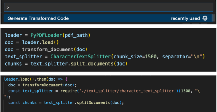 The plugin is connected to an LLM that transforms any piece of code from one programming language to another, changes the version of the code to a different one, or refactor the code based on specific parameters. Parameters include language or framework version, desired code standards that need to be followed (sync/async, loops, etc). When no parameters are provided, the extension performs a literal translation of the code.