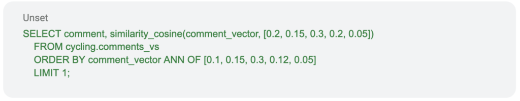 When selecting data, you can specify the similarity function, the vector column, and the vector to compare it with: